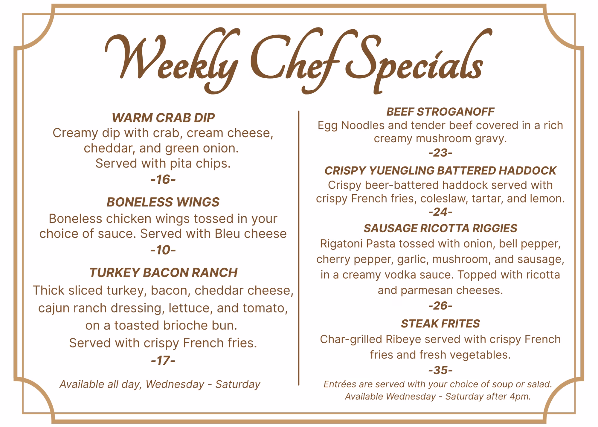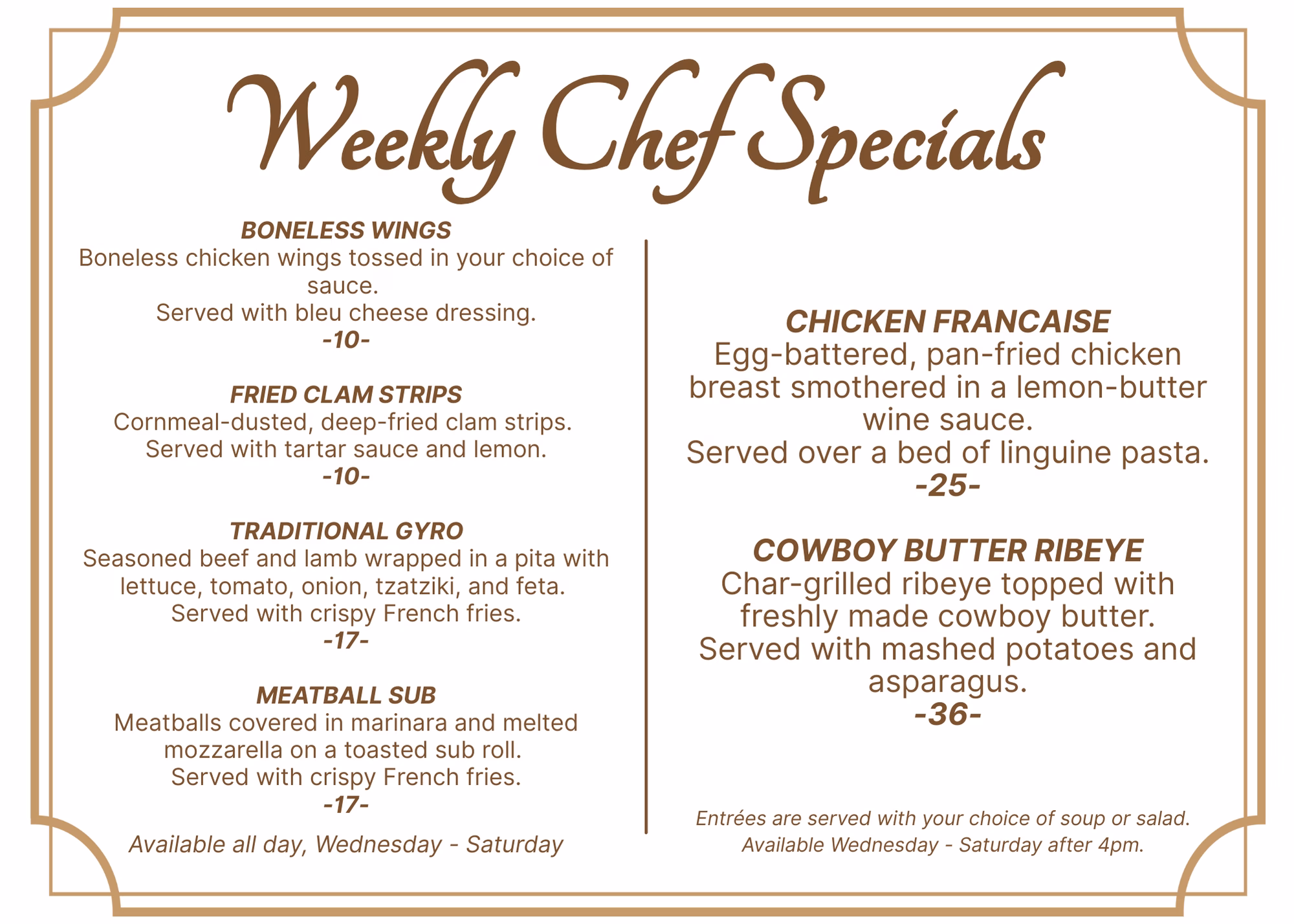 Enjoy delicious food and tasty drinks in our restaurant and pub, Wednesday – Saturday from 11a-9pm.