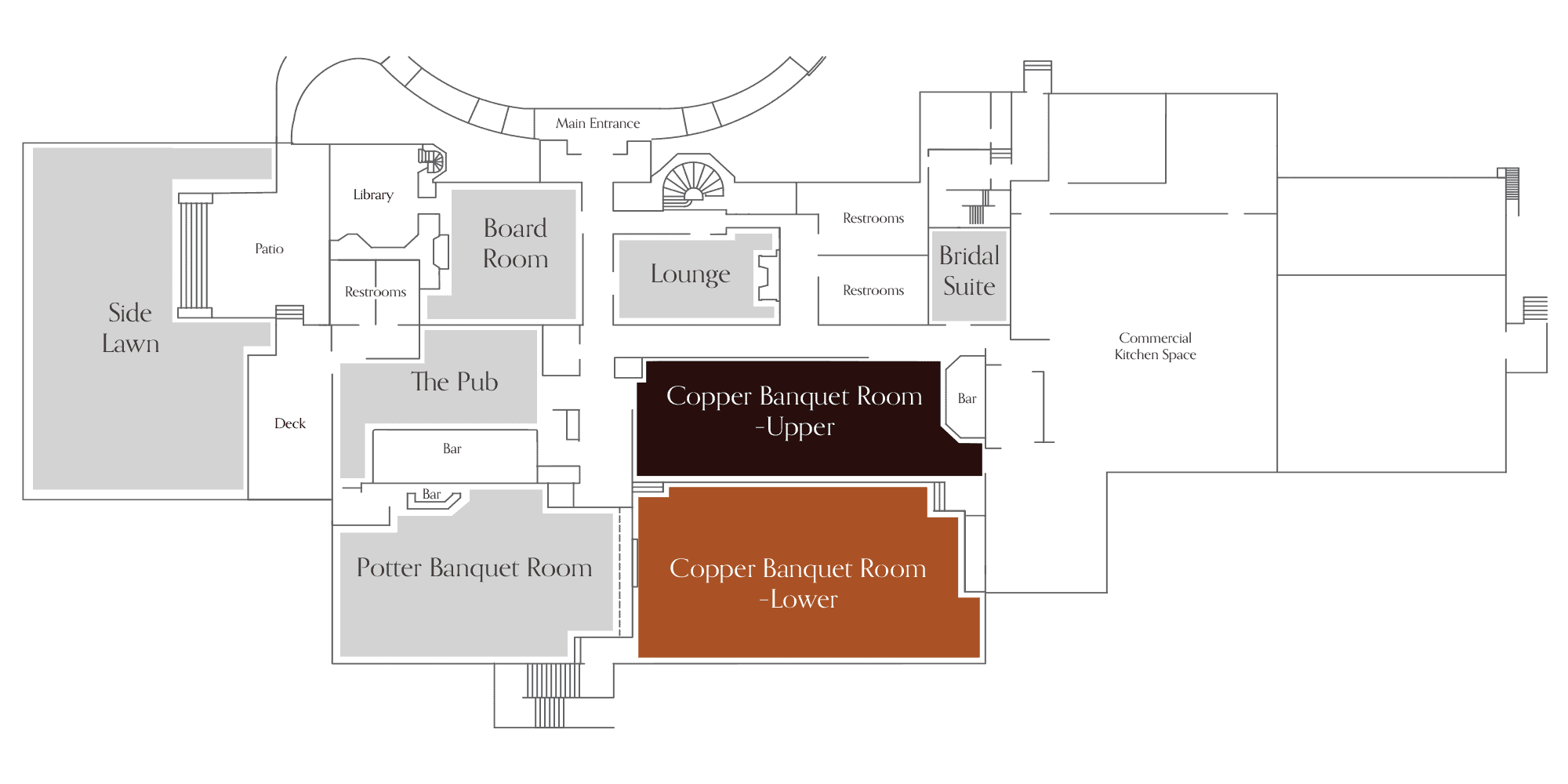 The Copper Room pays tribute to Rome, New York’s rich industrial heritage and its legacy as the Copper City. This elegant two-tiered space was added during the Destito family’s expansion of The Beeches in the 1950s and thoughtfully renovated after Nascentia Neighborhood acquired the property in 2021. With warm finishes and subtle metallic details, the Copper Room blends function and character, offering a memorable setting for gatherings of all kinds.