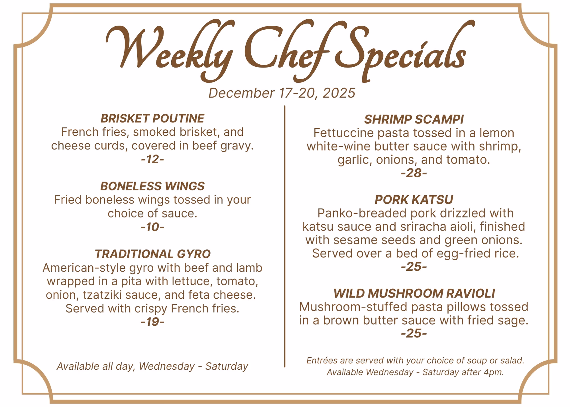 *Takeout is also available by phone, pickup only. The restaurant will be closed during scheduled private events.